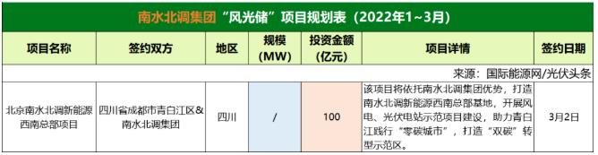 截至2022年3月31日,南水北調(diào)集團(tuán)共簽約(規(guī)劃)1個風(fēng)光儲項目,投資金額為100億元。