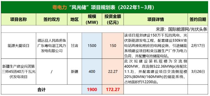 截至2022年3月31日,粵電力共簽約(規(guī)劃)2個風(fēng)光儲項目,明確規(guī)模共計1.9GW,明確投資金額共計172.27億元。