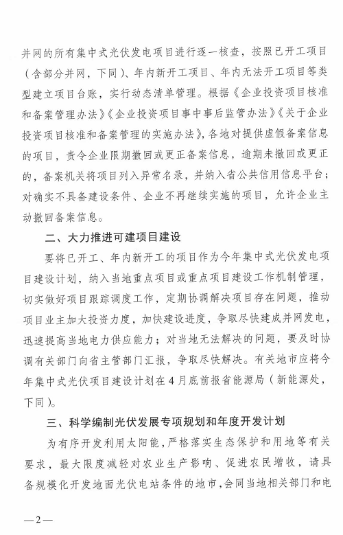 2.大力推進(jìn)可建項目建設(shè):要將已開工、年內(nèi)新開工的項目作為今年集中式光伏發(fā)電項目建設(shè)計劃,納入當(dāng)?shù)刂攸c(diǎn)項目或重點(diǎn)項目建設(shè)工作機(jī)制管理,