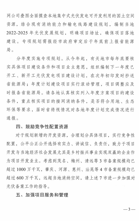 4.鼓勵競爭性配置資源:考慮到茂名、梅州、清遠(yuǎn)等3市備案規(guī)模均已超過1000萬千瓦,肇慶、河源、惠州、汕尾等4市備案規(guī)模均已超過600萬千瓦,遠(yuǎn)超當(dāng)?shù)叵{空間,請上述7市進(jìn)一步加強(qiáng)對光伏備案工作的指導(dǎo)。