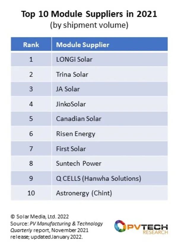 美通社消息——在PV-Tech發(fā)布的《2021年全球組件供應(yīng)商top10》排名中,前十名中國企業(yè)占7席,隆基、天合光能、晶澳太陽能、晶科能源依次位居2021年組件出貨量全球排名前四。