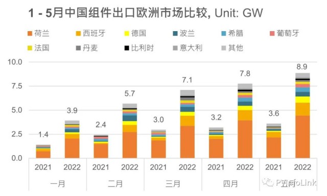目前中國主要出口成長的區(qū)域市場,仍是目前能源轉(zhuǎn)型最積極,同時也因俄羅斯和烏克蘭沖突下能源供應(yīng)不穩(wěn)定而面臨能源危機(jī)的歐洲。歐洲五月從中國進(jìn)口了8.9GW的光伏組件,同比成長146%,1 – 5月則是累計(jì)了33.3GW,同比成長144%,為各區(qū)域市場中成長最高。2021年歐洲全年進(jìn)口量已經(jīng)是最高的40.9GW,占中國2021年出口的46%,在基期已高且今年仍呈現(xiàn)逐月成長的態(tài)勢下,印證了歐洲市場對于光伏產(chǎn)品的需求仍然強(qiáng)勁。