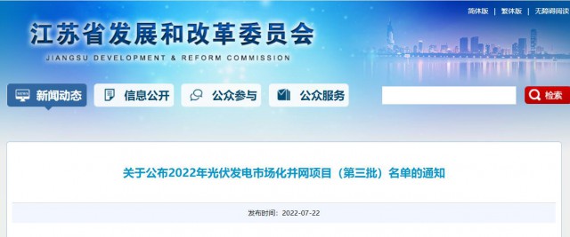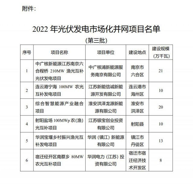 為積極貫徹落實國家“碳達峰碳中和”長期目標(biāo),推動我省光伏發(fā)電平穩(wěn)有序發(fā)展,按照《省發(fā)展改革委關(guān)于開展2022年光伏發(fā)電市場化并網(wǎng)項目開發(fā)建設(shè)的通知》(蘇發(fā)改能源發(fā)〔2022〕350號)有關(guān)要求,現(xiàn)將我省2022年光伏發(fā)電市場化并網(wǎng)項目(第三批)名單予以公布。