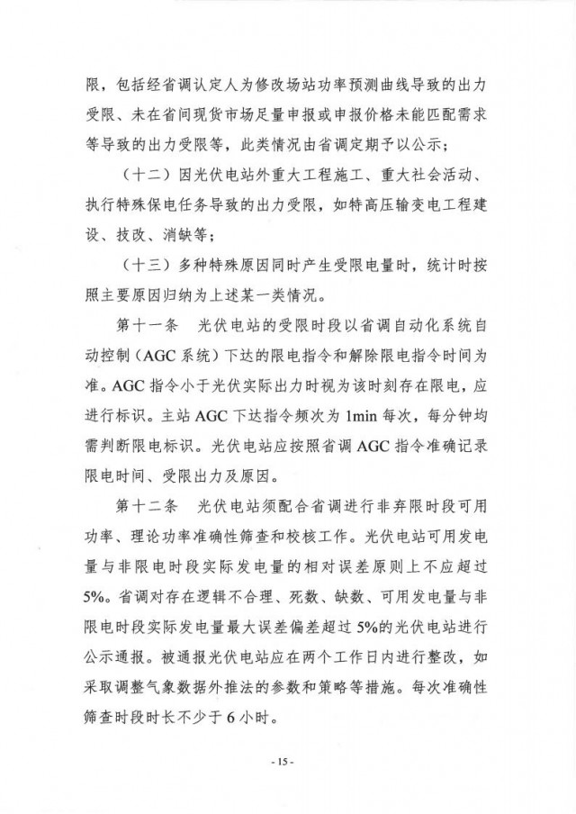 光伏電站可用發(fā)電量與非限電時(shí)段實(shí)際發(fā)電量的相對(duì)誤差原則上不應(yīng)超過5%。省調(diào)對(duì)存在邏輯不合理、死數(shù)、缺數(shù)、可用發(fā)電量與非限電時(shí)段實(shí)際發(fā)電量最大誤差偏差超過5%的光伏電站進(jìn)行公示通報(bào)。