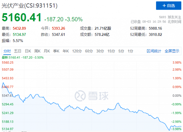 8月3日,受外圍利空因素影響,A股市場避險情緒高漲。受此影響,光伏板塊尾盤出現(xiàn)大幅跳水,中證光伏產(chǎn)業(yè)指數(shù)(CSI:931151)大跌3.5%,報收5160點。
