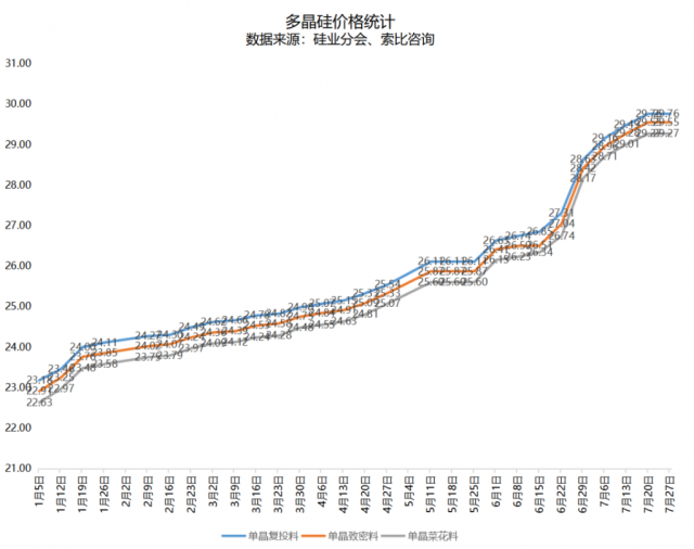 另根據(jù)7月27日,中國有色金屬工業(yè)協(xié)會硅業(yè)分會公布了太陽能級多晶硅最新價格:
