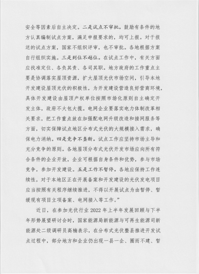 啟動整縣(市、區(qū))推進屋頂分布式光伏開發(fā)試點工作,主要目的就是充分調(diào)動和發(fā)揮地方積極性,引導(dǎo)地方政府協(xié)調(diào)更多屋頂資源,進一步開拓市場,擴大屋頂分布式光伏的建設(shè)規(guī)模。去年,國家能源局提出“在開展整縣(市、區(qū))推進屋頂分布式光伏開發(fā)試點工作中需要著重把握以下五個方面:一是自愿不強制。各地是否開展試點以及開展多少個試點由各地根據(jù)自身實際情況自己決定,不搞行政命令。建筑屋頂是否開展建設(shè),由屋頂產(chǎn)權(quán)單位綜合考慮屋頂承重、安全等因素后自主決定。二是試點不審批。鼓勵有條件的地方認(rèn)真編制試點方案,滿足申報要求的,均可上報。對于報送的試點方案,國家不組織評審,也不審批。各地根據(jù)方案自行組織實施。三是到位不越位。在試點工作中,有關(guān)方面應(yīng)找準(zhǔn)定位、各負其責(zé)、各司其職。地方政府的工作重點主要是協(xié)調(diào)落實屋頂資源,擴大屋頂光伏市場空間,引導(dǎo)本地開發(fā)建設(shè)屋頂光伏的積極性,為開發(fā)建設(shè)營造良好營商環(huán)境,具體開發(fā)建設(shè)由屋頂產(chǎn)權(quán)單位按照市場化原則自主確定開發(fā)主體,政府不大包大攬。電網(wǎng)企業(yè)要落實電力體制改革相關(guān)要求,把工作重點放在加強配電網(wǎng)升級改造和接網(wǎng)服務(wù)等方面,切實保障試點地區(qū)分布式光伏的大規(guī)模接入需求,確保電力消納。四是競爭不壟斷。試點工作應(yīng)堅持市場主導(dǎo)和充分競爭的原則。各地屋頂分布式光伏開發(fā)市場應(yīng)向所有符合條件的企業(yè)開放,企業(yè)可根據(jù)自身條件和優(yōu)勢,參與市場競爭,參加開發(fā)建設(shè)。五是工作不暫停。各地應(yīng)保持工作連續(xù)性,對于本地區(qū)正在開展備案和開發(fā)建設(shè)的光伏發(fā)電項目應(yīng)當(dāng)按照有關(guān)程序繼續(xù)推進,不得以開展試點為由暫停、暫緩現(xiàn)有項目立項備案、電網(wǎng)接入等工作。”