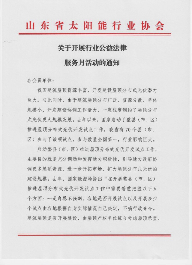 上述“一縣一企、圈而不建、暫停備案”等問題的存在,也嚴(yán)重影響了我省太陽能光伏行業(yè)企業(yè)、尤其是分布式光伏開發(fā)企業(yè)的健康穩(wěn)定發(fā)展。為進一步維護行業(yè)企業(yè)權(quán)益、提高行業(yè)企業(yè)法律意識、推動行業(yè)健康穩(wěn)定可持續(xù)發(fā)展,山東省太陽能行業(yè)協(xié)會擬于近期開展會員法律服務(wù)月活動,聘請國家級權(quán)威法律服務(wù)機構(gòu)為行業(yè)企業(yè)答疑解惑,并集中開展行業(yè)公益法律服務(wù)進企業(yè)活動,合法維護會員權(quán)利。