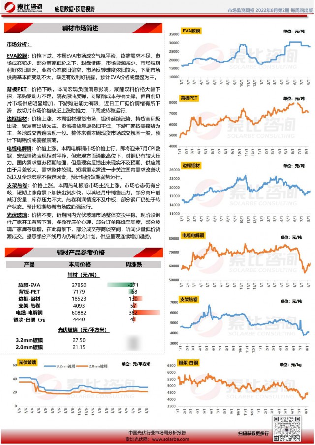 光伏產(chǎn)業(yè)周監(jiān)測(cè)報(bào)告系索比咨詢(xún)對(duì)于光伏產(chǎn)業(yè)鏈上下游價(jià)格的監(jiān)測(cè)與預(yù)報(bào),幫助企業(yè)獲得最實(shí)時(shí)的參考價(jià)格。每周除了對(duì)硅料、硅片、電池片、組件、輔材等價(jià)格進(jìn)行追蹤和分析外,亦關(guān)注下游招標(biāo)動(dòng)態(tài),并對(duì)后續(xù)市場(chǎng)趨勢(shì)做出研判。