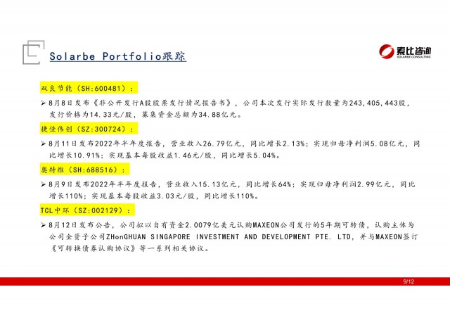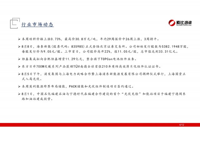 光儲投資周記系索比咨詢與買方機(jī)構(gòu)合作的日常投研回顧。每周除了簡要回顧光儲賽道政策、產(chǎn)業(yè)動(dòng)態(tài)、索比獨(dú)家重大資訊等產(chǎn)業(yè)信息外,亦對二級市場光儲賽道表現(xiàn)、共建投資組合表現(xiàn)、賽道重要觀點(diǎn)進(jìn)行跟蹤、分析研判。