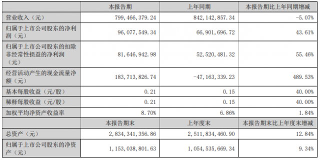 8月19日晚間,精功科技發(fā)布2022年半年度報告,報告期內,公司營業(yè)收入799,466,379.24元,同比下降5.07%,歸屬于上市公司股東的凈利潤96,077,549.34元,同比增加43.61%,詳情如下: