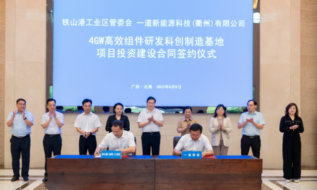 6月9日,一道新能簽約北海市投資建設的10GW高效組件研發(fā)科創(chuàng)制造基地項目,其中一期4GW高效組件研發(fā)科創(chuàng)制造基地項目將建設6條光伏組件生產線。
