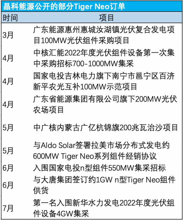 產能不斷攀升的同時,晶科能源主推的n型Tiger Neo系列組件在市場上斬獲大量訂單,大大加速了TOPCon產業(yè)化進程。晶科能源公開的部分Tiger Neo訂單包括: