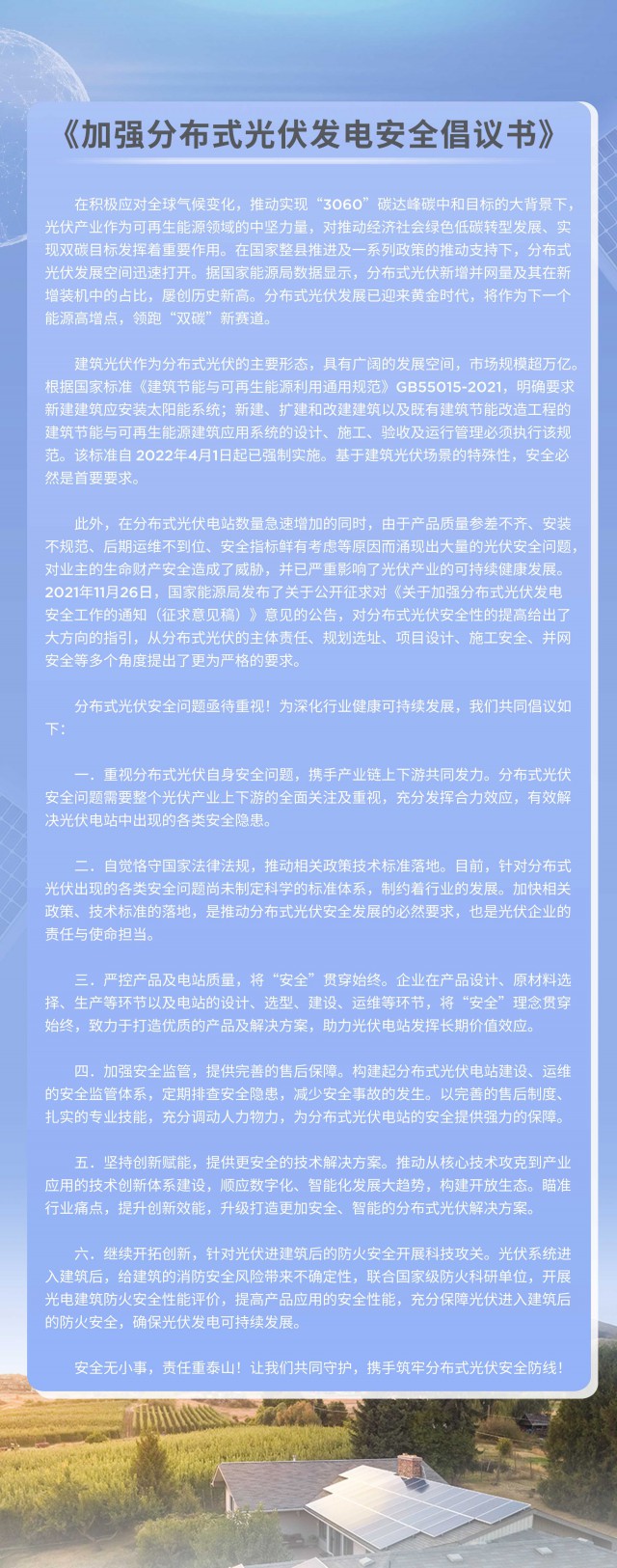 前不久,昱能科技聯(lián)合中國建筑科學研究院防火研究所、華為數(shù)字能源、優(yōu)得運維、固德威、史陶比爾、杭州龍焱、武漢日新等8家單位,共同發(fā)起了行業(yè)首個關于分布式光伏發(fā)電安全倡議及發(fā)布了《加強分布式光伏發(fā)電安全倡議書》,號召行業(yè)聚焦光伏安全問題。從《倡議書》內(nèi)容看,除了強調(diào)遵守相關法律法規(guī),重視安全問題以外,還需要光伏企業(yè)在產(chǎn)品設計、原材料選擇、生產(chǎn)等環(huán)節(jié)以及電站的設計、選型、建設、運維等環(huán)節(jié),將“安全”理念貫穿始終,致力于打造優(yōu)質(zhì)的產(chǎn)品及解決方案。