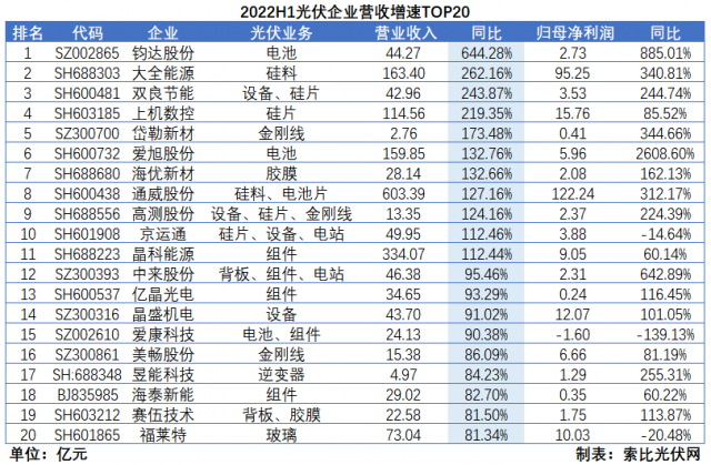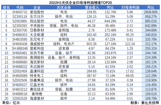 利潤增速方面,除了硅料企業(yè)延續(xù)高增長以外,去年因硅料價格暴漲而出現(xiàn)虧損的產(chǎn)業(yè)鏈中游專業(yè)化廠商,2022年上半年受益于供應(yīng)鏈管理能力的提升以及產(chǎn)品結(jié)構(gòu)的優(yōu)化,紛紛迎來困境翻轉(zhuǎn),其中愛旭股份、東方日升、中來股份的利潤增速分別達(dá)到2609%、958%和643%。此外,岱勒新材、東尼電子兩大金剛線廠商受益于硅片環(huán)節(jié)的擴(kuò)產(chǎn)以及細(xì)線化發(fā)展趨勢,疊加自身的產(chǎn)能擴(kuò)張和成本下降,利潤增速均超300%。