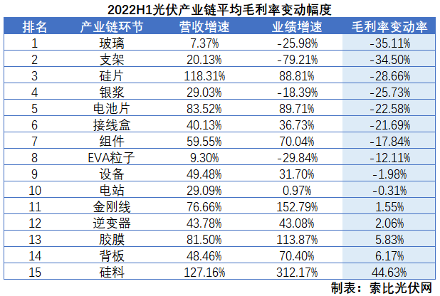 結(jié)合產(chǎn)業(yè)鏈來看,玻璃環(huán)節(jié)隨著去年一季度末新增產(chǎn)能的投產(chǎn),產(chǎn)品價格相較于去年同期大幅下滑,導(dǎo)致毛利率平均降幅高達(dá)35.11%。PV Infolink數(shù)據(jù)顯示,2022年上半年光伏玻璃3.2mm鍍膜和2.0mm鍍膜平均價格較去年同期分別下滑18%和23%。