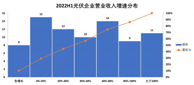2022年上半年,79家光伏企業(yè)合計創(chuàng)收5571億元,平均增速(“平均”指“中位數(shù)”,下同)達(dá)到48%。令人欣喜的是,營收負(fù)增長的企業(yè)占比僅為10%,而營收增速超過40%的企業(yè)占比則高達(dá)71%。其中,除了硅料企業(yè)繼續(xù)保持高速增長以外,眾多“跨界者”也乘著光伏行業(yè)的“東風(fēng)”,迎來暴發(fā)式增長。