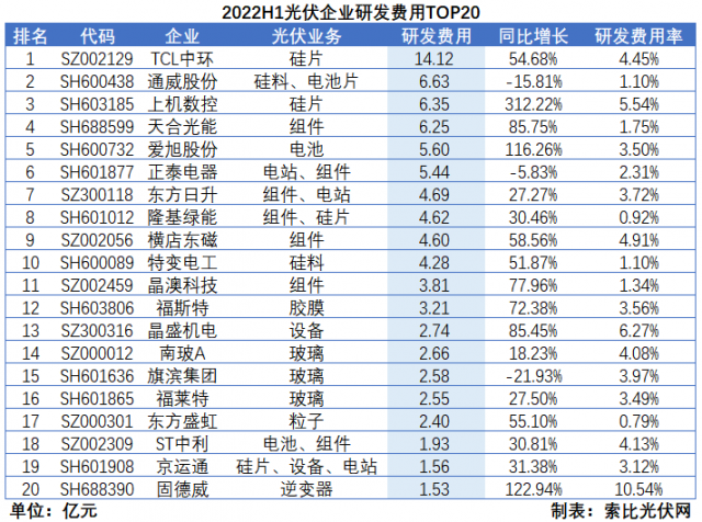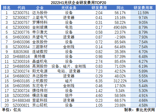 當(dāng)然,N型電池技術(shù)之所以能夠不斷取得突破性進(jìn)展,離不開生產(chǎn)設(shè)備的持續(xù)升級與迭代。在研發(fā)費(fèi)用率排名中,前20位中有10家是設(shè)備廠商,其中HJT設(shè)備龍頭邁為股份的研發(fā)費(fèi)用率更是高達(dá)11.59%。在近期的中報業(yè)績交流會中,邁為股份表示預(yù)計今年下半年HJT組件成本能夠與PERC組件持平,至2023年HJT電池片成本優(yōu)勢將會逐步顯現(xiàn)。