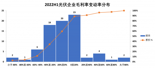雖然2022年上半年光伏行業(yè)依然延續(xù)了高速增長態(tài)勢,多數(shù)光伏企業(yè)也取得了不錯的經(jīng)營業(yè)績,但受到原材料價格大幅上漲、供需關(guān)系變化以及市場競爭加劇等因素的影響,多數(shù)光伏企業(yè)的毛利率相比于去年同期均出現(xiàn)了不同程度的下滑。根據(jù)索比光伏網(wǎng)的統(tǒng)計,79家光伏企業(yè)的毛利率平均降幅達(dá)到8.94%,而降幅超過20%的企業(yè)占比更是高達(dá)34%。