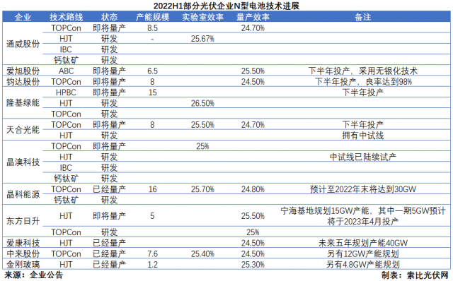 受益于此,光伏企業(yè)的經(jīng)營業(yè)績維持高速增長態(tài)勢,其中營收增速和歸母凈利潤增速中位數(shù)分別達(dá)到48%和32%。然而,在經(jīng)營業(yè)績保持高速增長的同時,多數(shù)光伏企業(yè)的毛利率卻出現(xiàn)了不同程度的下滑。不過,電池片廠商的盈利能力卻逆勢上揚(yáng),邊際改善顯著。同時,隨著N型電池技術(shù)的產(chǎn)業(yè)化落地逐步加速,各大廠商也紛紛加碼技術(shù)研發(fā),并重點(diǎn)披露了技術(shù)進(jìn)展情況。