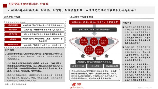 光伏組件常鋪設(shè)在氣候相對(duì)惡劣的環(huán)境下長(zhǎng)期承受顯著的老化應(yīng)力,包括來自紫外線、極端溫度、顯著溫差、冷熱應(yīng)力和高濕度等的環(huán)境應(yīng)力;光伏背板作為保護(hù)組件的最外層材料,對(duì)電池片、EVA膠膜等材料的侵蝕起到絕緣保護(hù)作用,也是長(zhǎng)期保證光伏組件的光電轉(zhuǎn)換效率的關(guān)鍵;具備高耐候性對(duì)組件長(zhǎng)期戶外服役極為重要,需耐濕熱、耐紫外、耐高低溫、耐環(huán)境腐蝕;針對(duì)光伏背板的耐候性,不同材質(zhì)背板表現(xiàn)差異較大,通常需要綜合考慮壽命、制造成本、回收、以及替換成本,以滿足應(yīng)用端的綜合需求,做到更低的度電成本。