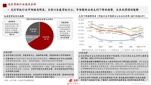 光伏背板廣泛應(yīng)用于太陽能電池(光伏)組件,在國(guó)家政策的整體推動(dòng)下,光伏產(chǎn)業(yè)進(jìn)入爆發(fā)式增長(zhǎng)階段,同時(shí)將帶動(dòng)背板行業(yè)的快速發(fā)展與規(guī)模擴(kuò)張。目前背板行業(yè)整體呈現(xiàn),含氟背板為主,玻璃背板為輔,非氟背板較少的市場(chǎng)格局。近年光伏背板行業(yè)毛利率具有顯著的下降趨勢(shì),行業(yè)頭部5家企業(yè)最低已降至10%以下,主要由原材料成本上漲導(dǎo)致,企業(yè)積極采取應(yīng)對(duì)措施,趨勢(shì)或?qū)⒌玫骄徑狻?/p>
