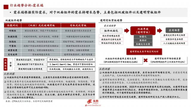 需求端根據(jù)實(shí)際需求,對(duì)于雙面組件的需求持增長(zhǎng)態(tài)勢(shì),主要包括雙玻組件以及透明背板組件。