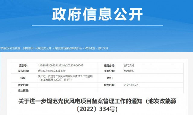 9月22日,安徽青陽縣發(fā)改委官網(wǎng)公布《關(guān)于進一步規(guī)范光伏風(fēng)電項目備案管理工作的通知》。