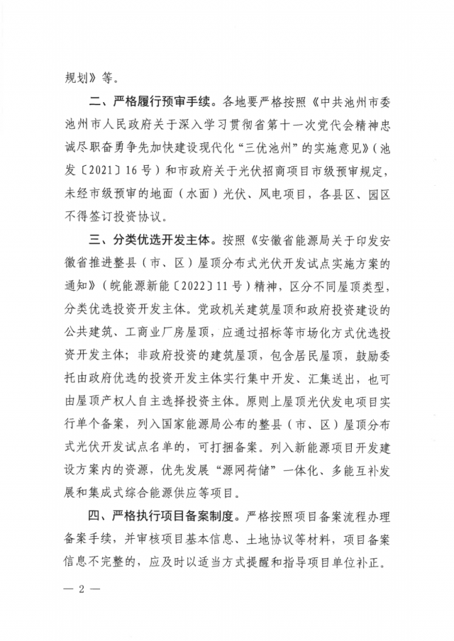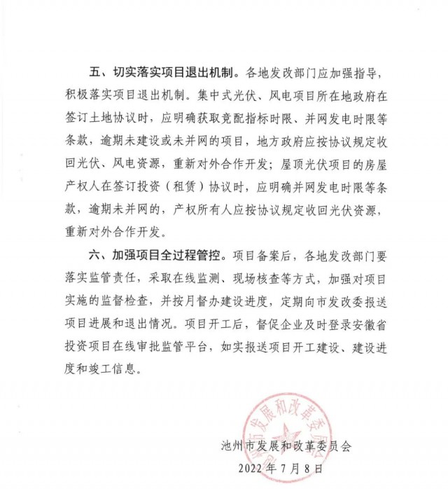 通知強調(diào):各地要嚴(yán)格按照《中共池州市委池州市人民政府關(guān)于深入學(xué)習(xí)貫徹省第十一次黨代會精神忠誠盡職奮勇爭先加快建設(shè)現(xiàn)代化“三優(yōu)池州”的實施意見》(池發(fā)(2021] 16號)和市政府關(guān)于光伏招商項目市級預(yù)審規(guī)定,未經(jīng)市級預(yù)審的地面(水面)光伏、風(fēng)電項目,各縣區(qū)、園區(qū)不得簽訂投資協(xié)議。