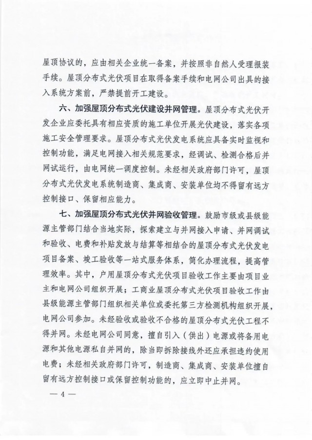 以自然人名義提交的并網(wǎng)申請(qǐng)資料中,如果含有以企業(yè)名義租賃自然人屋頂協(xié)議的,應(yīng)由相關(guān)企業(yè)統(tǒng)一備案,并按照非自然人受理報(bào)裝 手續(xù)。屋頂分布式光伏項(xiàng)目在取得備案手續(xù)和電網(wǎng)公司出具的接入系統(tǒng)方案前,嚴(yán)禁提前開(kāi)工建設(shè)。