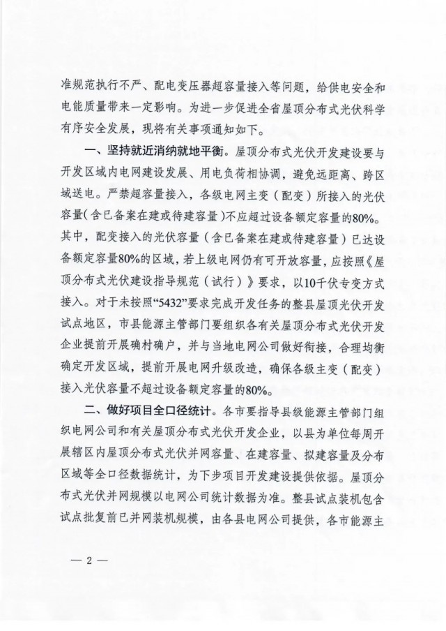 對(duì)于未按照“5432”要求完成開(kāi)發(fā)任務(wù)的整縣屋頂光伏開(kāi)發(fā)試點(diǎn)地區(qū),市縣能源主管部門(mén)要組織各有關(guān)屋頂分布式光伏開(kāi)發(fā) 企業(yè)提前開(kāi)展確村確戶,并與當(dāng)?shù)仉娋W(wǎng)公司做好銜接,合理均衡確定開(kāi)發(fā)區(qū)域,提前開(kāi)展電網(wǎng)升級(jí)改造,確保各級(jí)主變(配變)接入光伏容量不超過(guò)設(shè)備額定容量的80%。