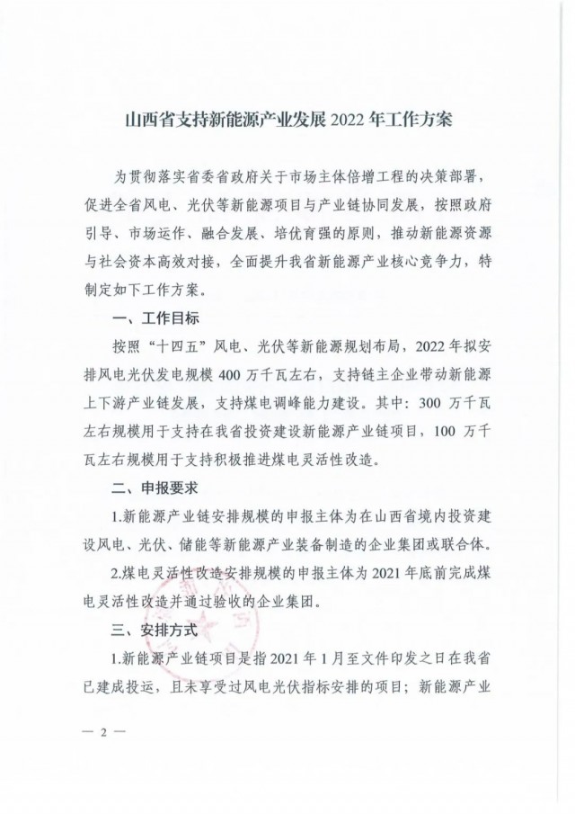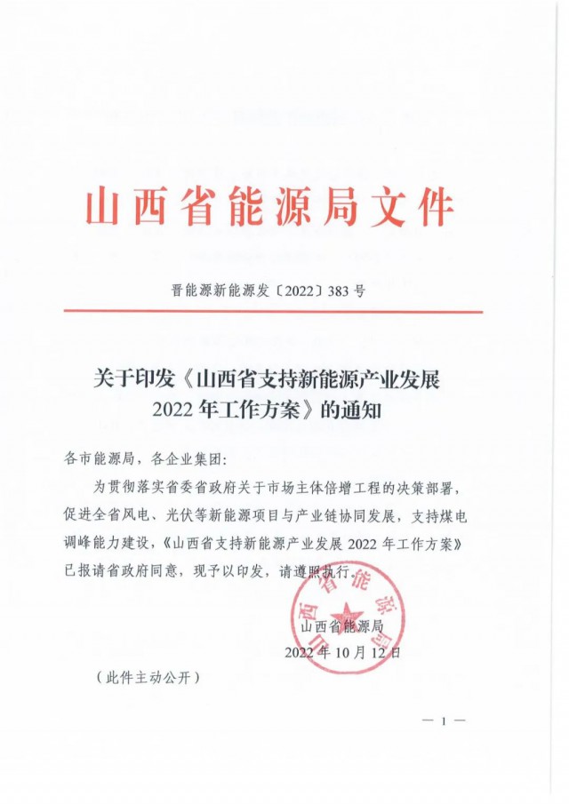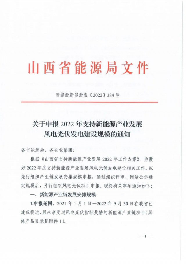 10月12日,山西省能源局印發(fā)《山西省支持新能源產(chǎn)業(yè)發(fā)展2022年工作方案》、《關(guān)于申報(bào)2022年支持新能源產(chǎn)業(yè)發(fā)展風(fēng)電光伏發(fā)電建設(shè)規(guī)?!返耐ㄖ?,擬先行組織產(chǎn)業(yè)鏈發(fā)展安排規(guī)模申報(bào)3GW以及1GW煤電靈活性調(diào)峰改造配套風(fēng)光項(xiàng)目。