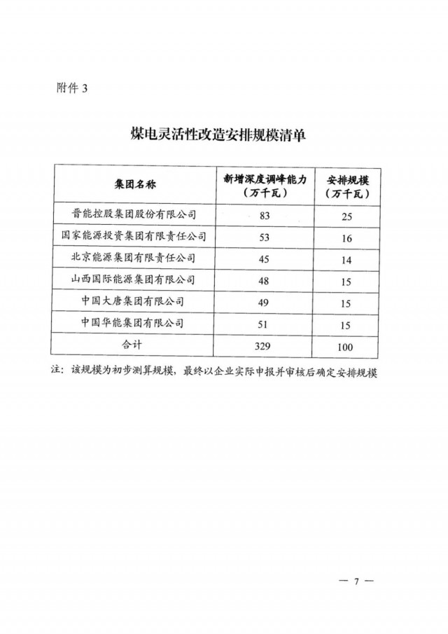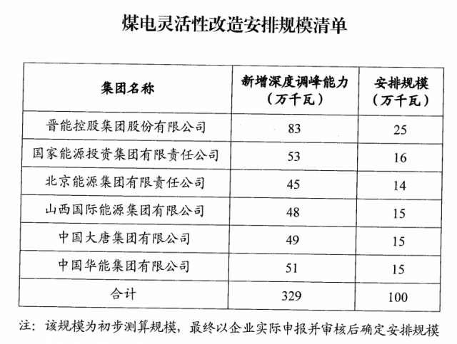 煤電靈活性改造調(diào)峰配套新能源項(xiàng)目的申報(bào)范圍則是2021年底前完成改造的煤電機(jī)組,安排規(guī)模則是按照新增深度調(diào)峰能力的30%確定。初步測(cè)算確定晉能、國(guó)家能源集團(tuán)、京能、山西國(guó)際能源、大唐、華能6家企業(yè)獲得1GW煤電改造配套項(xiàng)目,具體仍需以企業(yè)實(shí)際申報(bào)規(guī)模為準(zhǔn)。
