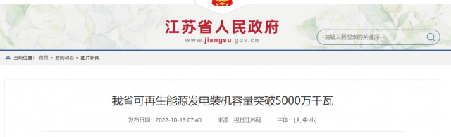 截至2022年10月11日,江蘇省可再生能源發(fā)電總裝機突破5000萬千瓦,達到5109萬千瓦,其中風(fēng)電2247萬千瓦,光伏2277萬千瓦,生物質(zhì)295萬千瓦,抽水蓄能260萬千瓦,儲能30萬千瓦。