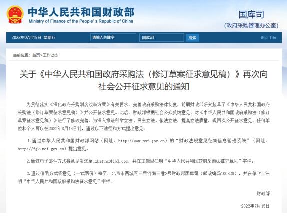 ?圖:財(cái)政部國(guó)庫司發(fā)布關(guān)于《中華人民共和國(guó)政府采購(gòu)法(修訂草案征求意見稿)》