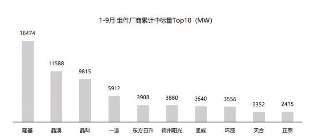 ?圖:據(jù)公開數(shù)據(jù)統(tǒng)計(jì),2022年1-9月組件廠商累計(jì)中標(biāo)量(MW)