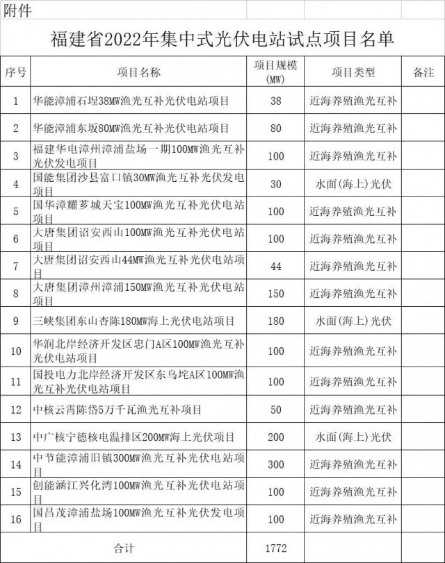 10月20日,福建省發(fā)改委發(fā)布《2022年集中式光伏電站試點項目名單的通知》,共計16個項目,規(guī)模為1.772GW。