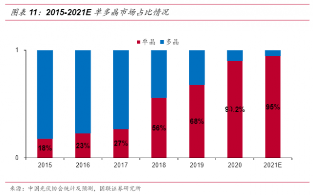 國聯(lián)證券研究所的數(shù)據(jù)顯示:2018年,單晶的市場(chǎng)份額占比達(dá)到了56%,到2021年則高達(dá)95%。五年間,單晶硅市場(chǎng)占比翻了5倍。
