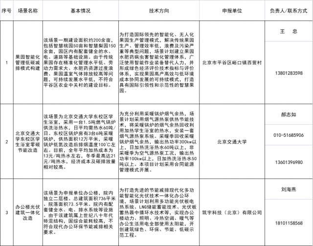 為推進(jìn)本市構(gòu)建市場導(dǎo)向的綠色技術(shù)創(chuàng)新體系工作,根據(jù)《北京市關(guān)于進(jìn)一步完善市場導(dǎo)向的綠色技術(shù)創(chuàng)新體系若干措施》(京發(fā)改〔2021〕1411號,以下簡稱《若干措施》)、《北京市創(chuàng)新型綠色技術(shù)及示范應(yīng)用項目征集遴選管理細(xì)則》(京發(fā)改規(guī)〔2021〕9號),我們組織開展了創(chuàng)新型綠色技術(shù)應(yīng)用場景征集工作。經(jīng)公開征集、資料審核和現(xiàn)場調(diào)研,現(xiàn)發(fā)布第一批創(chuàng)新型綠色技術(shù)應(yīng)用場景。若有意愿在上述應(yīng)用場景開展技術(shù)應(yīng)用的單位,可與應(yīng)用場景負(fù)責(zé)人聯(lián)系,自行溝通協(xié)商后續(xù)合作工作。后期,我們將持續(xù)跟蹤應(yīng)用場景技術(shù)應(yīng)用情況,并按照《若干措施》要求,對符合條件的技術(shù)應(yīng)用效果第三方評價進(jìn)行支持。
