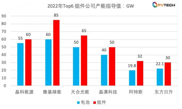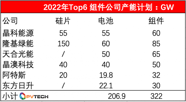 而根據晶科、隆基、天合、晶澳、阿特斯、東方日升 2022中報披露的數據,到2022年底,各家組件規(guī)劃產能分別為60GW、85GW、65GW、50GW、32GW、30GW,這六 家公司2022 年底組件產能將達到322 GW,數值驚人。