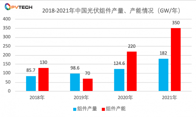 中國光伏行業(yè)協(xié)會(CPIA)數據顯示,2021年中國光伏組件產能為350 GW/年,同比增59.09%;該年實際組件產量為182GW,同比2020年增46.07%。