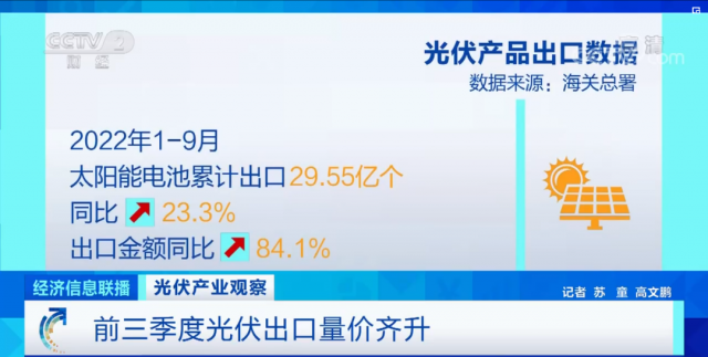 光伏產(chǎn)品的出口表現(xiàn)也超出預期,海關數(shù)據(jù)顯示,今年前9個月,太陽能電池累計出口29.55億個,同比增長23.3%,出口金額同比增加84.1%,實現(xiàn)量價齊升。