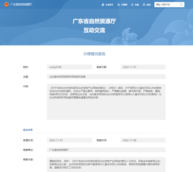 11月8日,廣東省自然資源廳公布了網(wǎng)友提問光伏復(fù)合項目使用農(nóng)用地相關(guān)政策的問題,并作出回答,詳情如下: