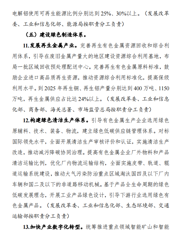 提高可再生能源使用比例,鼓勵企業(yè)在資源環(huán)境可承載的前提下向可再生能源富集地區(qū)有序轉(zhuǎn)移,逐步減少使用火電的電解鋁產(chǎn)能。利用電解鋁、工業(yè)硅等有色金屬生產(chǎn)用電量大、負(fù)荷穩(wěn)定等特點(diǎn),支持企業(yè)參與以消納可再生能源為主的微電網(wǎng)建設(shè),支持具備條件的園區(qū)開展新能源電力專線供電,提高消納能力。鼓勵和引導(dǎo)有色金屬企業(yè)通過綠色電力交易、購買綠色電力證書等方式積極消納可再生能源,確保可再生能源電力消納責(zé)任權(quán)重高于本區(qū)域最低消納責(zé)任權(quán)重。力爭2025年、2030年電解鋁使用可再生能源比例分別達(dá)到25%、30%以上。
