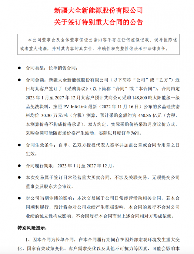 11月21日,大全能源(688303.SH)公告稱,與某客·戶簽訂《采購協(xié)議》,合同約定2023年1月至2027年12月某客戶預(yù)計(jì)采購148,800噸太陽能級(jí)一級(jí)品免洗塊料,按照PVInfolink最新公布的多晶硅致密料均價(jià)30.30萬元/噸(含稅)測(cè)算,預(yù)計(jì)采購金額約為450.86億元。