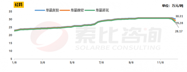 硅料價(jià)格連續(xù)兩周下跌,上周單晶復(fù)投均價(jià)30.31萬元/噸,單晶致密均價(jià)29.28萬元/噸,單晶菜花均價(jià)28.17萬元/噸。