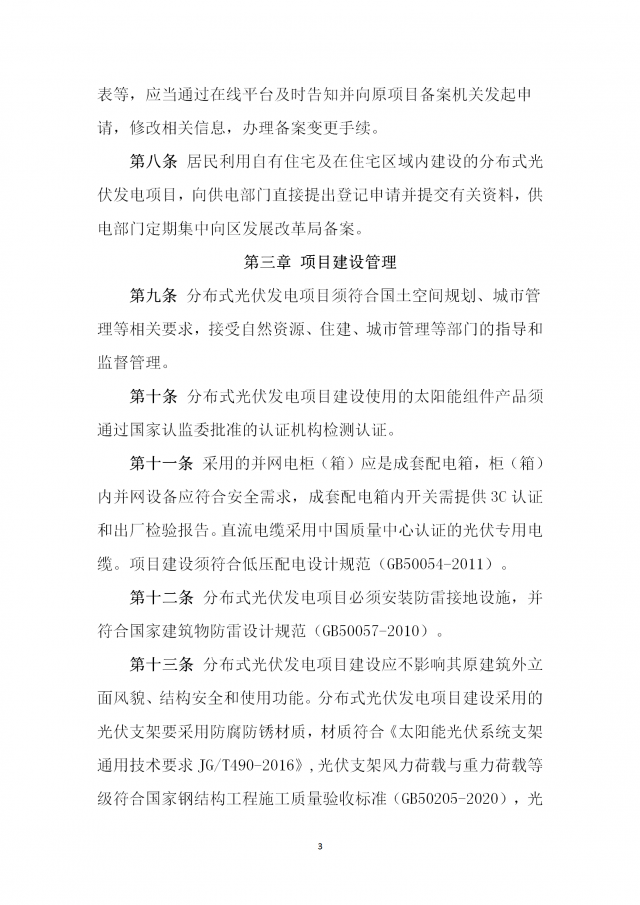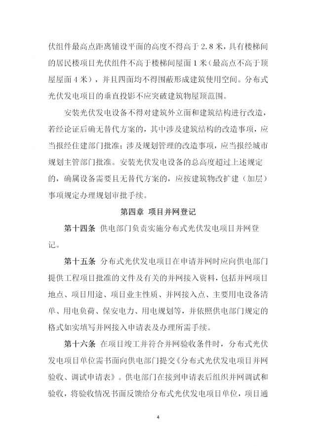 文件指出,分布式光伏發(fā)電項目建設采用的光伏支架要采用防腐防銹材質(zhì),材質(zhì)符合《太陽能光伏系統(tǒng)支架通用技術要求JG/T490-2016》,光伏支架風力荷載與重力荷載等級符合國家鋼結(jié)構(gòu)工程施工質(zhì)量驗收標準(GB50205-2020),光伏組件最高點距離鋪設平面的高度不得高于2.8米,具有樓梯間的居民樓項目光伏組件不高于樓梯間屋面1米(最高點不高于頂屋屋面4米),并且四面均不得圍蔽形成建筑使用空間。分布式光伏發(fā)電項目的垂直投影不應突破建筑物屋頂范圍。
