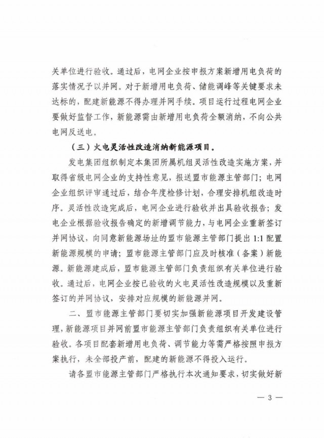發(fā)電集團(tuán)組織制定本集團(tuán)所屬機(jī)組靈活性改造實施方案,并取得省級電網(wǎng)企業(yè)的支持性意見,報送盟市能源主管部門:電網(wǎng)企業(yè)組織評審?fù)ㄟ^后,結(jié)合年度檢修計劃,合理安排機(jī)組改造時序。靈活性改造完成后,電網(wǎng)企業(yè)進(jìn)行驗收并出具驗收報告:發(fā)電企業(yè)根據(jù)驗收報告確定的新增調(diào)節(jié)能力,與電網(wǎng)企業(yè)重新簽訂并網(wǎng)協(xié)議,向同意新能源場址的盟市能源主管部門提出 1:1 配置新能源規(guī)模的申請;盟市能源主管部門應(yīng)及時核準(zhǔn)(備案)新能源。新能源建成后,盟市能源主管部門負(fù)責(zé)組織有關(guān)單位進(jìn)行驗收。通過后,電網(wǎng)企業(yè)按已驗收的火電靈活性改造規(guī)模以及重新簽訂的并網(wǎng)協(xié)議,安排對應(yīng)規(guī)模的新能源并網(wǎng)。