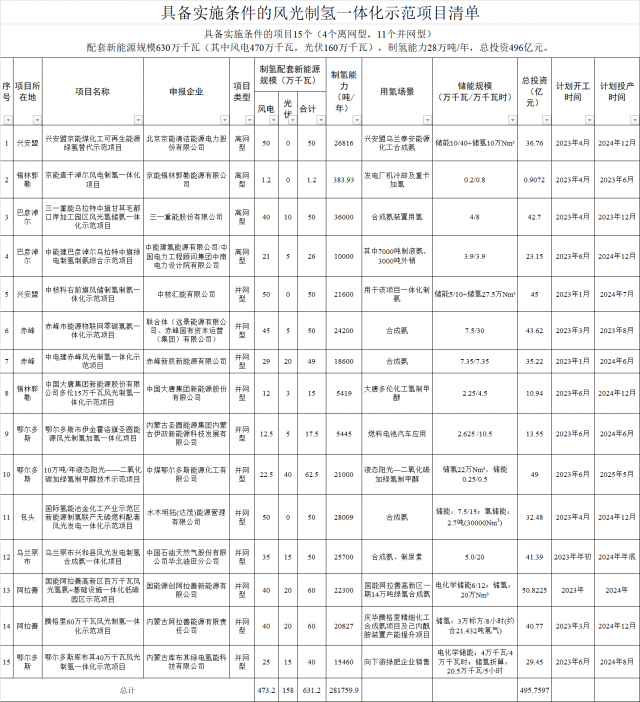 通知顯示:按照《內(nèi)蒙古自治區(qū)人民政府辦公廳關(guān)于促進(jìn)氫能產(chǎn)業(yè)高質(zhì)量發(fā)展的意見(jiàn)》和《內(nèi)蒙古自治區(qū)風(fēng)光制氫一體化示范項(xiàng)目實(shí)施細(xì)則(2022年版)》有關(guān)要求,經(jīng)自治區(qū)人民政府同意,計(jì)劃實(shí)施興安盟京能煤化工可再生能源綠氫替代示范項(xiàng)目等15個(gè)風(fēng)光制氫一體化示范項(xiàng)目。具備實(shí)施條件的項(xiàng)目15個(gè)(4個(gè)離網(wǎng)型,11個(gè)并網(wǎng)型),配套新能源規(guī)模631.2萬(wàn)千瓦(其中風(fēng)電473.2萬(wàn)千瓦,光伏158萬(wàn)千瓦),制氫能力28.2萬(wàn)噸/年,總投資495.8億元。