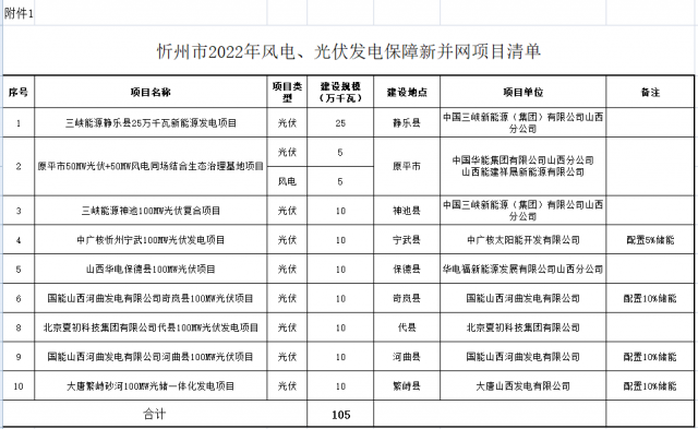 按照山西省能源局《關(guān)于下達(dá)山西省2022年風(fēng)電光伏發(fā)電保障性并網(wǎng)年度建設(shè)計(jì)劃的通知》(晉能源新能源發(fā)〔2022〕428號(hào))和《關(guān)于下達(dá)山西省2022年支持新能源產(chǎn)業(yè)發(fā)展風(fēng)電光伏發(fā)電建設(shè)計(jì)劃的通知》(晉能源新能源發(fā)〔2022〕429號(hào)),2022年度山西省能源局共下達(dá)我市風(fēng)電、光伏發(fā)電項(xiàng)目共27個(gè)326萬(wàn)千瓦,其中下達(dá)2022年度保障性并網(wǎng)項(xiàng)目9個(gè)105萬(wàn)千瓦(詳見(jiàn)附件1),下達(dá)支持新能源產(chǎn)業(yè)發(fā)展風(fēng)電、光伏發(fā)電建設(shè)項(xiàng)目18個(gè)221萬(wàn)千瓦(詳見(jiàn)附件2)。為做好項(xiàng)目建設(shè)有關(guān)工作,現(xiàn)就有關(guān)要求通知如下: